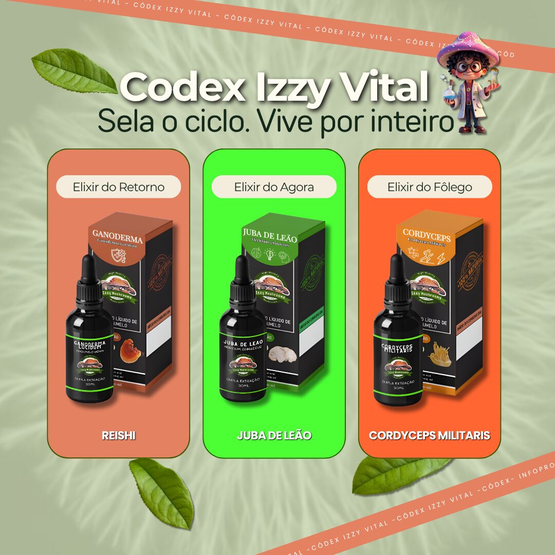 Juba de Leão, Cordyceps Militaris e Reishi reunidos no Codex Izzy Vital — teu ritual natural de clareza, energia e presença.